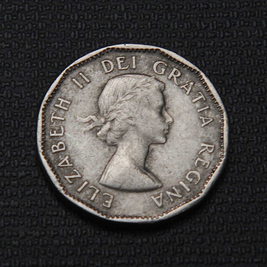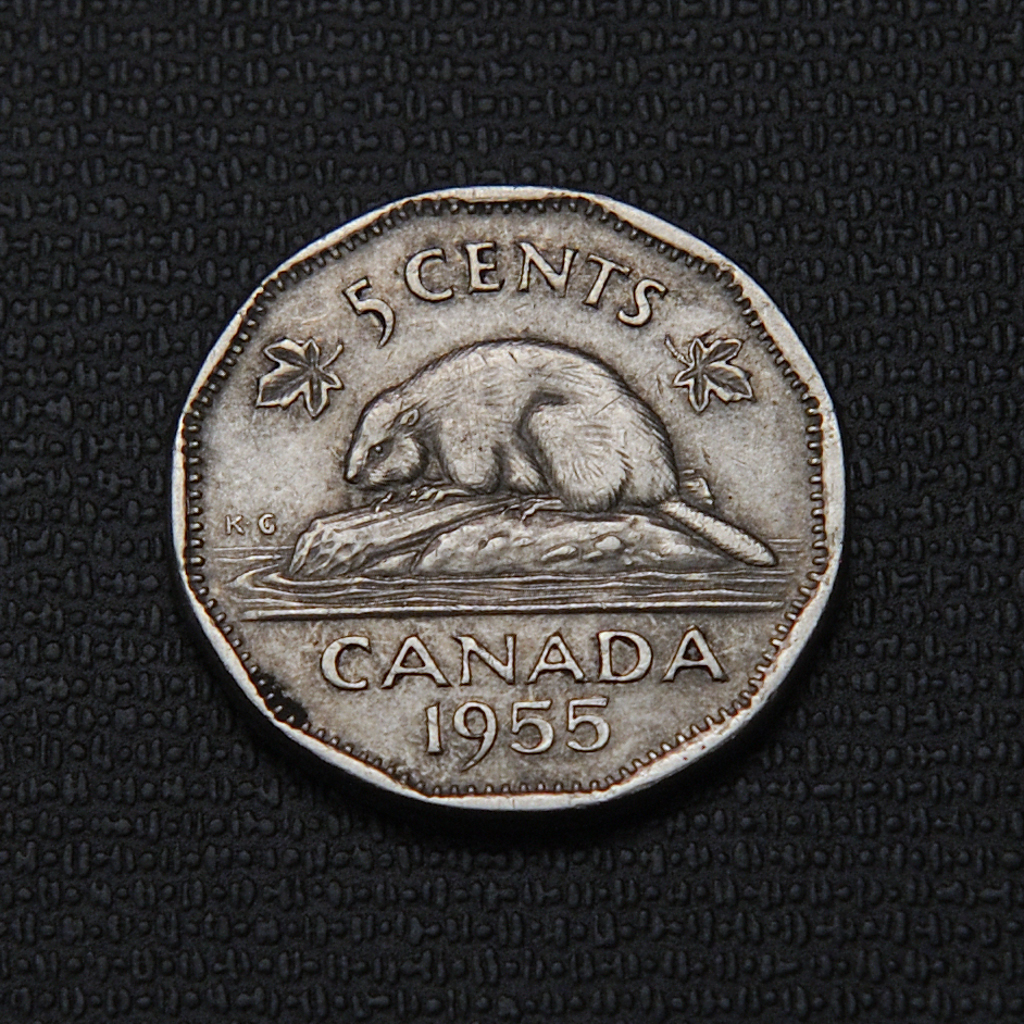 The 1955 Canadian 5 cents coin, known as the “nickel,” was minted by the Royal Canadian Mint in Ottawa and made of 99.9% nickel. It weighs 4.54 grams, with a diameter of 21.3 mm and has a smooth (plain) edge with medal alignment. The obverse features a young Queen Elizabeth II wearing a laurel wreath, designed by Mary Gillick, bearing the inscription “ELIZABETH II DEI GRATIA REGINA.” The reverse, designed by G. E. Kruger-Gray, depicts a beaver sitting on a log—a symbol closely associated with Canada—along with two maple leaves. Approximately 5,355,028 of these coins were minted in 1955. This coin is magnetic due to its nickel content and was the first year of the series to return to nickel after a previous period of chromium-plated steel composition. It retains a modest collector’s value, increasing significantly if in uncirculated or mint condition.
