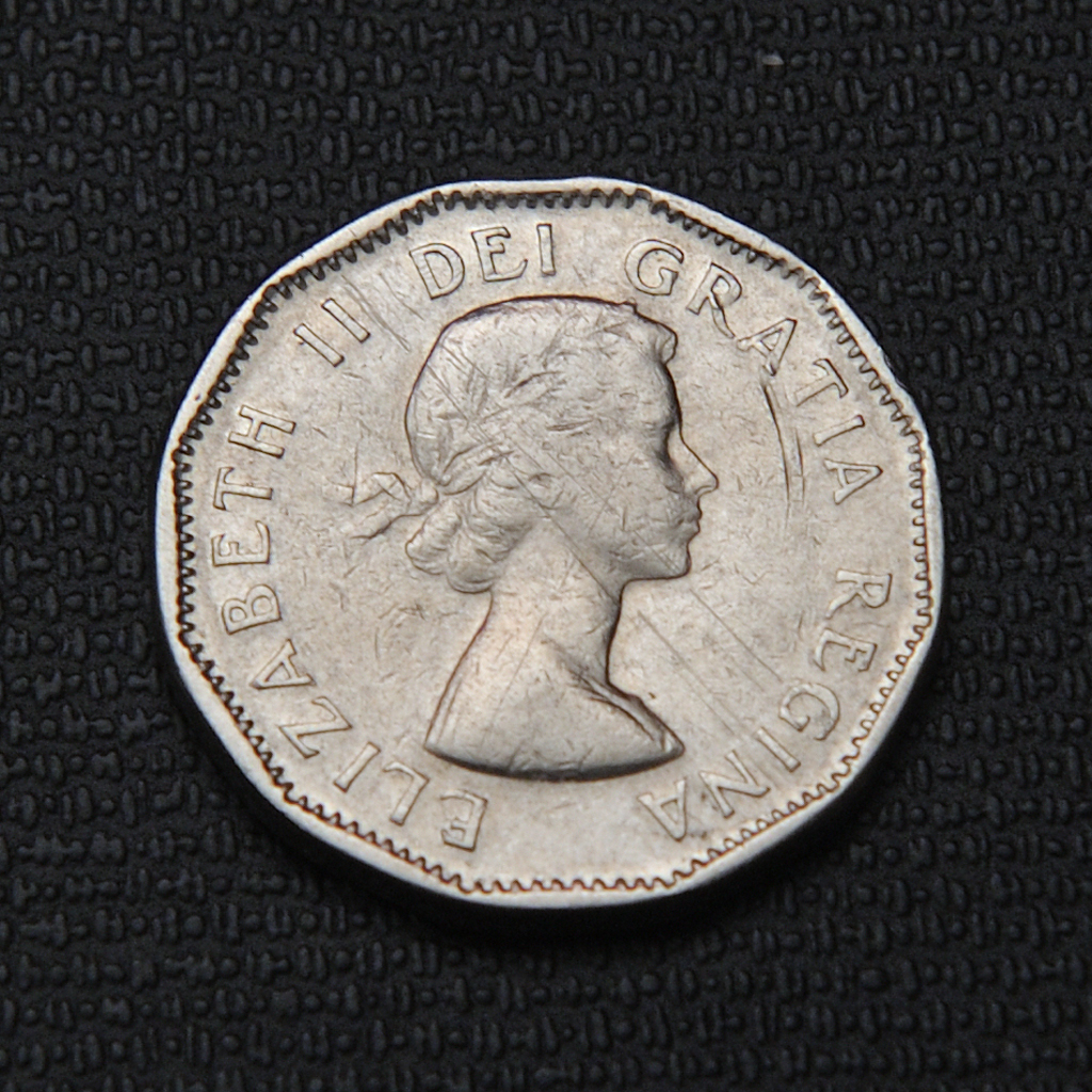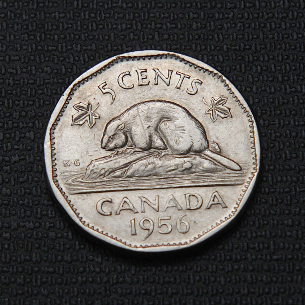 The Canadian 5 cents coin from 1956 is made of 100% nickel, weighing 4.54 grams, with a diameter of approximately 21.2 mm and a plain edge. The coin features the obverse design of Queen Elizabeth II wearing a laurel wreath, designed by Mary Gillick, with the inscription “ELIZABETH II DEI GRATIA REGINA.” The reverse showcases a beaver sitting on a log, designed by George E. Kruger-Gray, symbolizing Canadian industriousness. This coin was minted by the Royal Canadian Mint in Ottawa, with a mintage of about 9,399,854 pieces, and is magnetic due to its nickel composition. It was issued shortly after Queen Elizabeth II began her reign in 1952 and is a business strike coin intended for circulation. Its melt value is around $0.12 CAD, and uncirculated examples are worth more to collectors depending on condition.