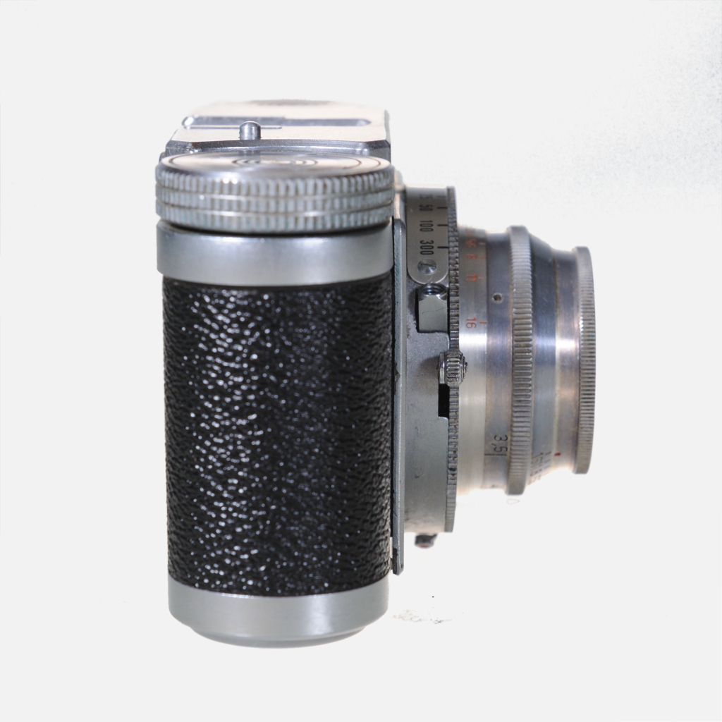 The Braun Paxette I is a well-built, compact 35mm rangefinder camera from the early 1950s, featuring a fixed 45mm f/2.8 Pointikar lens combined with a Prontor S shutter offering speeds from 1 second to 1/300 second plus bulb, as well as X and M flash synchronisation and a built-in self-timer. It has a scale-focus system and an extinction meter to help with exposure, and film advance is originally done via a knob (later models featured a lever). The camera is characterized by its flat top without the four “horns” found on later Paxette II models, a frame counter integrated into the accessory shoe, and a sturdy, solid German industrial design with very few awkward design quirks, making it a classic example of early post-war German 35mm cameras. Its compact yet durable body and straightforward controls reflect the technological style and quality of the era, with a strong emphasis on mechanical precision and simplicity.