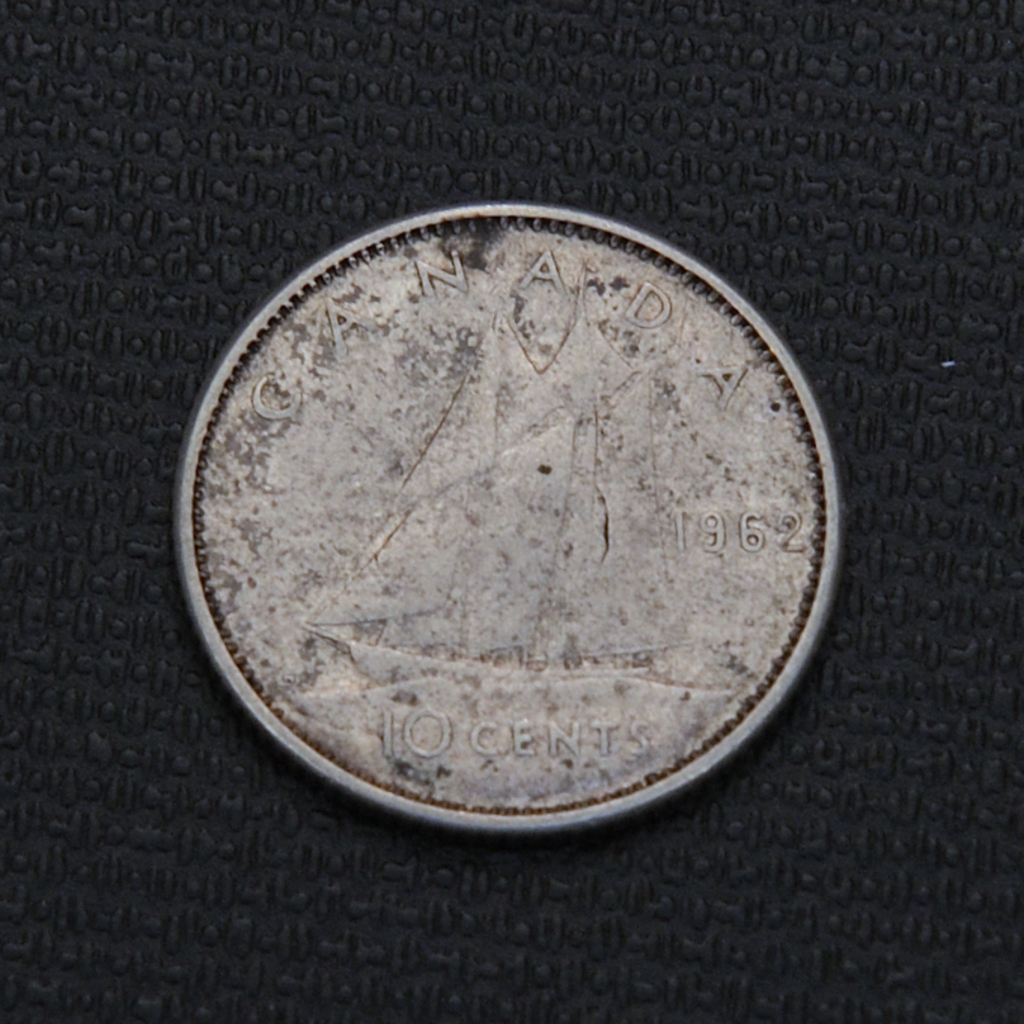 The 1962 Canadian 10 cents coin, also known as the dime, features on its obverse side a right-profile bust of Queen Elizabeth II wearing a laurel wreath, designed by Mary Gillick. The reverse side displays the iconic Bluenose schooner, a celebrated racing and fishing vessel symbolizing Canada’s maritime heritage, crafted by Emanuel Hahn. This coin is composed of 80% silver and 20% copper, weighs 2.33 grams, and has a diameter of 18.03 mm with a reeded edge. It was minted by the Royal Canadian Mint, with a circulation mintage of approximately 41.8 million coins. The inscription around the obverse reads “ELIZABETH II DEI GRATIA REGINA,” and the reverse shows “CANADA 1962 10 CENTS.” The Bluenose schooner on the reverse symbolizes the significance of the fishing industry and maritime skills in Canada. This coin is non-magnetic, has a thickness of 1.16 mm, and the orientation follows medal alignment. The 1962 Canadian dime is valued for both its silver content and numismatic interest depending on its condition, ranging from circulated coins to mint state ones.
