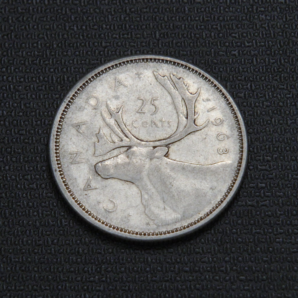 The 1963 Canadian 25 cents quarter is a silver coin made of 80% silver and 20% copper, featuring on the obverse a young Queen Elizabeth II wearing a laurel wreath designed by Mary Gillick, and on the reverse, a caribou head designed by Emanuel Hahn, with a diameter of 23.88 mm and a reeded edge. This business strike coin has a mintage of over 21 million and is known for its silver content and elegant design used from 1953 to 1964.