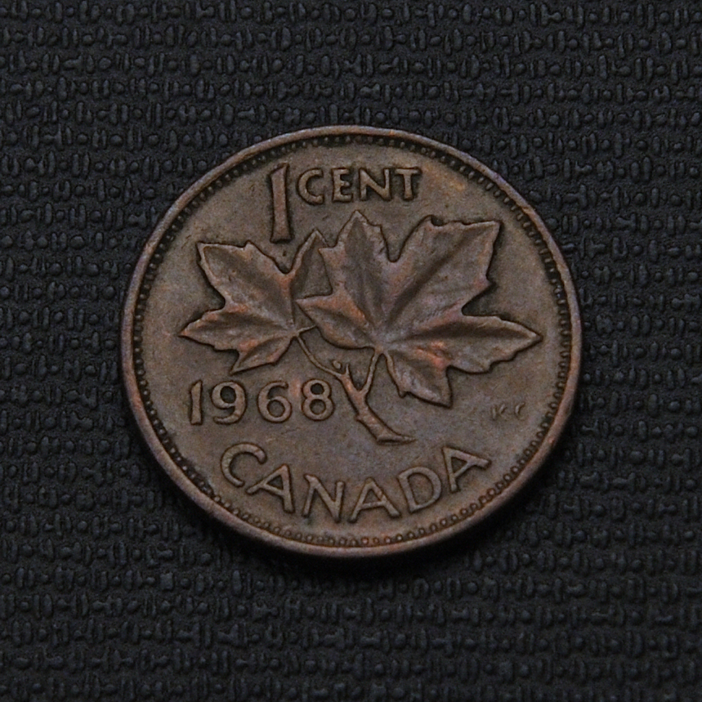The 1968 Canadian 1 cent coin is a mostly copper circulation coin featuring Queen Elizabeth II on the obverse and two maple leaves on a twig on the reverse, with a plain edge and a large mintage of over 329 million.