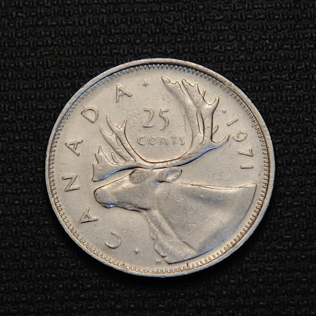 The 1971 Canadian 25-cent quarter features a caribou head designed by Emanuel Hahn on the reverse, with a left-facing bust of Queen Elizabeth II and the inscription “ELIZABETH II D.G. REGINA” on the obverse, is made of 99.9% nickel, weighs 5.05 grams, and has a diameter of 23.88 mm.