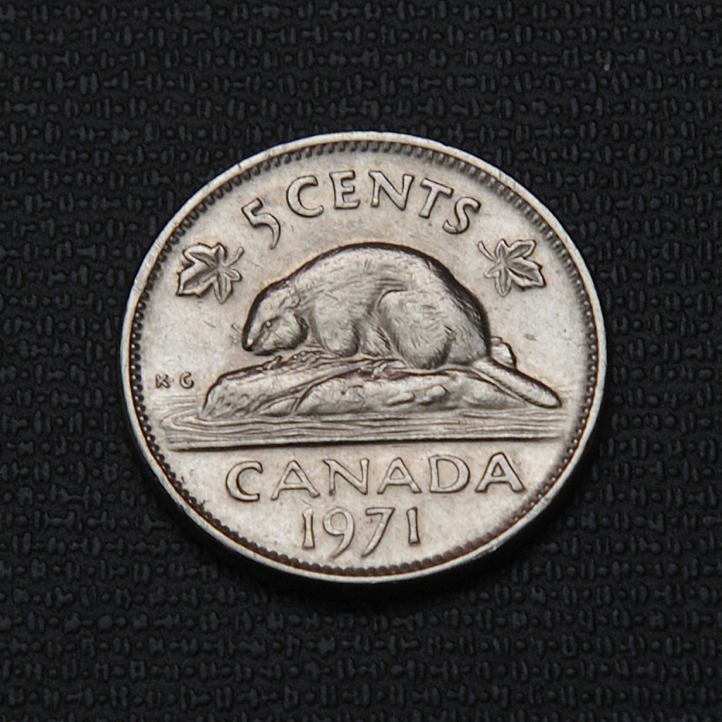 The 1971 Canadian 5 cents coin is a nickel coin with a diameter of 21.21 mm and a weight of 4.54 grams. It features on the obverse the bust of Queen Elizabeth II wearing a tiara, designed by Arnold Machin, and on the reverse a beaver sitting on a log, designed by G.E. Kruger-Gray. The coin has a plain edge and a medal alignment axis. The inscription on the obverse reads “ELIZABETH II D – G – REGINA,” while the reverse is marked with “5 CENTS CANADA 1971,” flanked by two maple leaves. This coin was minted in a quantity of 27,312,609 pieces by the Royal Canadian Mint and is composed entirely of nickel, making it magnetic. It was issued primarily for circulation, but uncirculated and specimen finishes also exist.