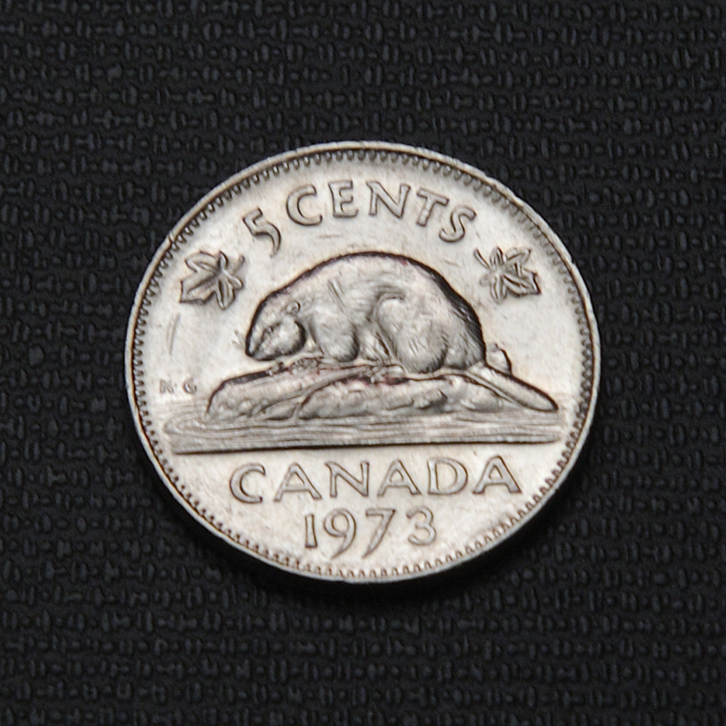 The 1973 Canadian 5 cents coin is a nickel with a Queen Elizabeth II obverse and a beaver reverse, made of pure nickel and widely circulated the same year.