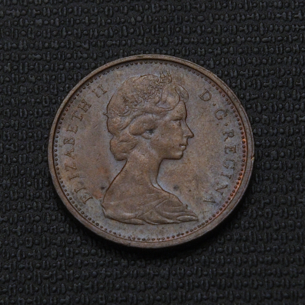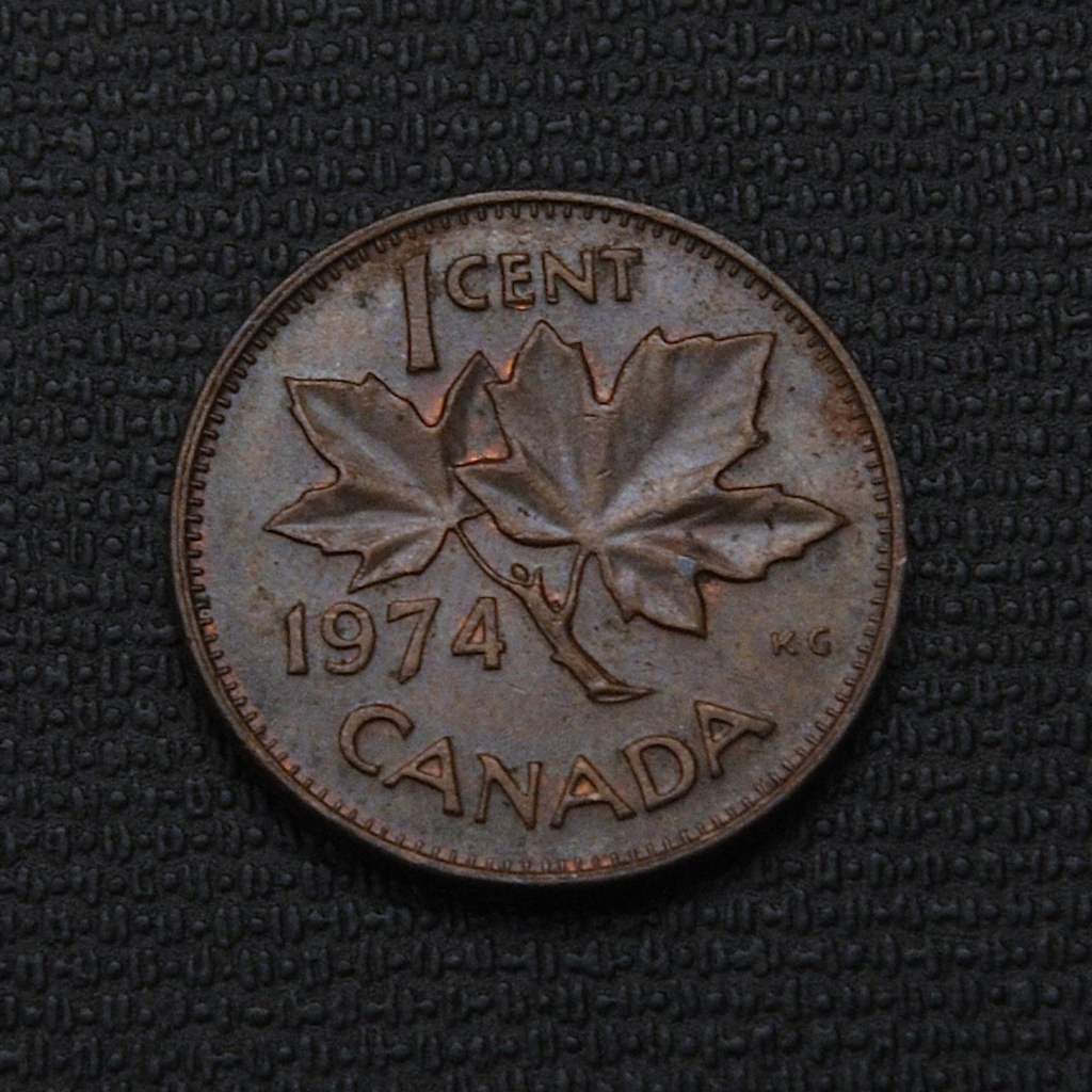 The 1974 Canadian 1 cent coin is a copper coin featuring Queen Elizabeth II on the obverse and two maple leaves on the reverse, produced in large numbers as a symbol of Canadian identity.