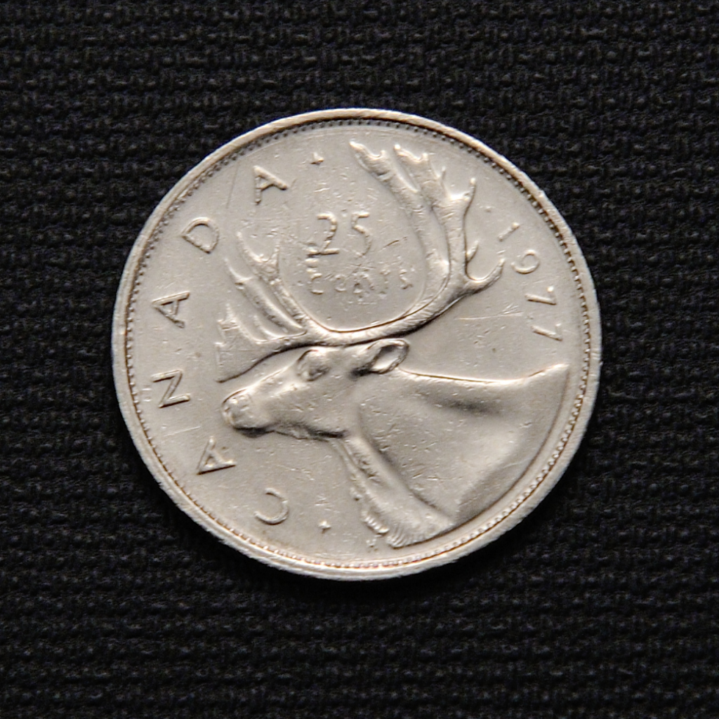 The 1977 Canadian 25 cents quarter features on the obverse a left-facing bust of Queen Elizabeth II wearing a tiara, and on the reverse, it depicts a caribou head with the denomination “25 CENTS” inscribed between the caribou’s antlers; the coin is made of nickel, weighs 5.07 grams, and has a diameter of 23.88 mm with a reeded edge.