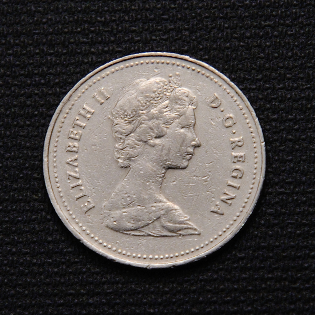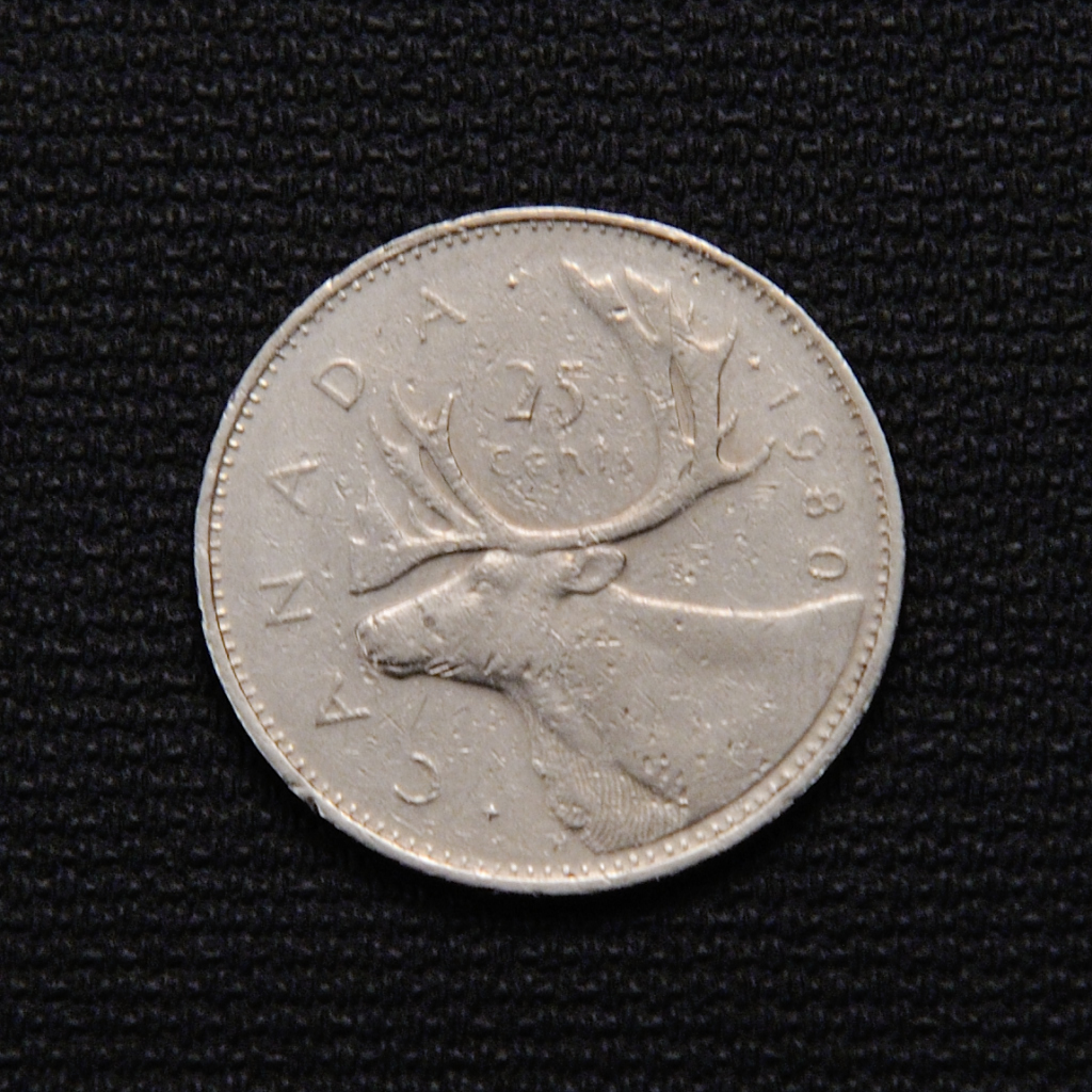 The Canadian 25-cent coin minted in 1980 is a small, circular piece made primarily of nickel, weighing 5.07 grams with a diameter of 23.88 mm and a reeded edge. The obverse features a right-facing bust of Queen Elizabeth II wearing a tiara, designed by Arnold Machin, while the reverse displays the classic caribou head by Emanuel Hahn, both designs reflecting Canada’s tradition in coin imagery. Issued by the Royal Canadian Mint for circulation, this coin is magnetic and its edge orientation is ↑↑ (medal alignment); over 76 million were minted in 1980, making it widely available but prized by collectors in high grades.