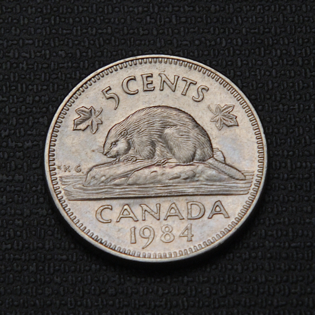 The 1984 Canadian 5 cents coin, minted by the Royal Canadian Mint, is composed of 75% copper and 25% nickel with a weight of 4.6 grams and a diameter of 21.2 millimeters. It features the second portrait of Queen Elizabeth II wearing a tiara on the obverse, designed by Arnold Machin, with the inscription “ELIZABETH II D – G – REGINA.” The reverse side, designed by G.E. Kruger-Gray, displays a detailed beaver sitting on a log, a classic Canadian symbol used since 1937, along with the inscriptions “5 CENTS” and “CANADA 1984.” The coin has a plain smooth edge and medal alignment orientation. Its mintage was 84,088,000 coins, making it common in circulation, but higher uncirculated grades are more valued by collectors.