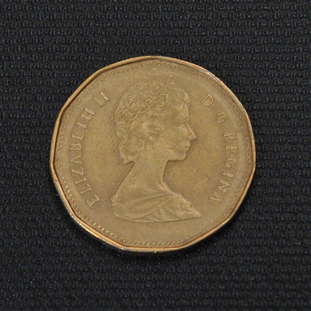 The Canadian 1988 one dollar “loonie” coin features Queen Elizabeth II on the front and a loon on water on the back, with an eleven-sided gold appearance.