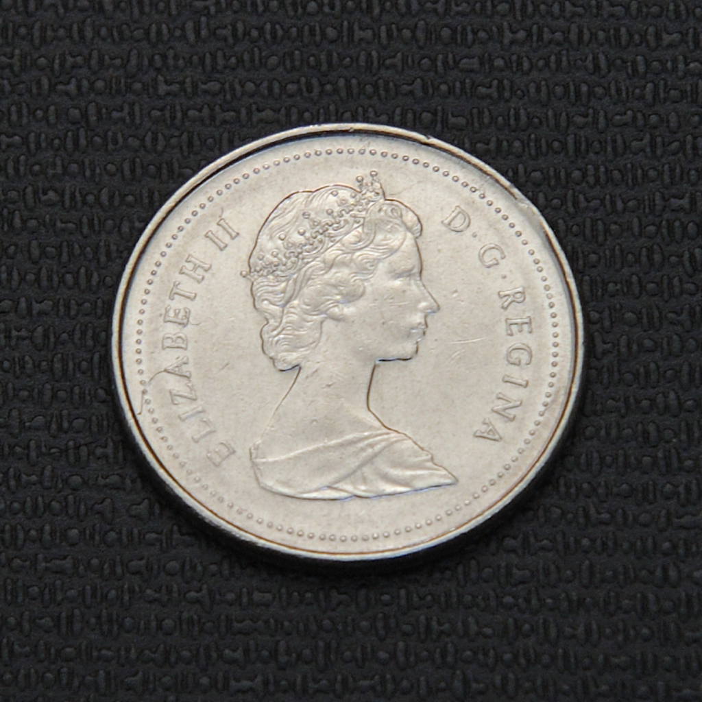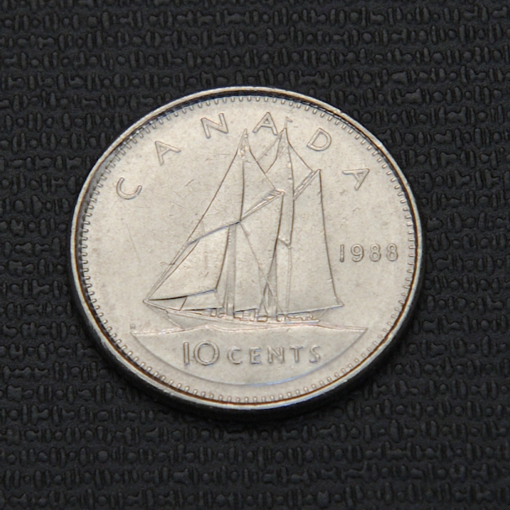 The 1988 Canadian 10 cents coin, minted by the Royal Canadian Mint, is composed entirely of nickel and has a weight of 2.07 grams, a diameter of 18.03 mm, and a thickness of 1.16 mm with a reeded edge. It features on the obverse a bust of Queen Elizabeth II wearing a tiara, designed by Arnold Machin, and on the reverse, a stylized image of the famous Bluenose schooner sailing, designed by Emanuel Hahn. The coin’s legend includes “ELIZABETH II D – G – REGINA” on the obverse and “CANADA 1988 10 CENTS” on the reverse, with magnetic properties due to its nickel composition. In 1988, about 163 million of these dimes were minted for circulation.