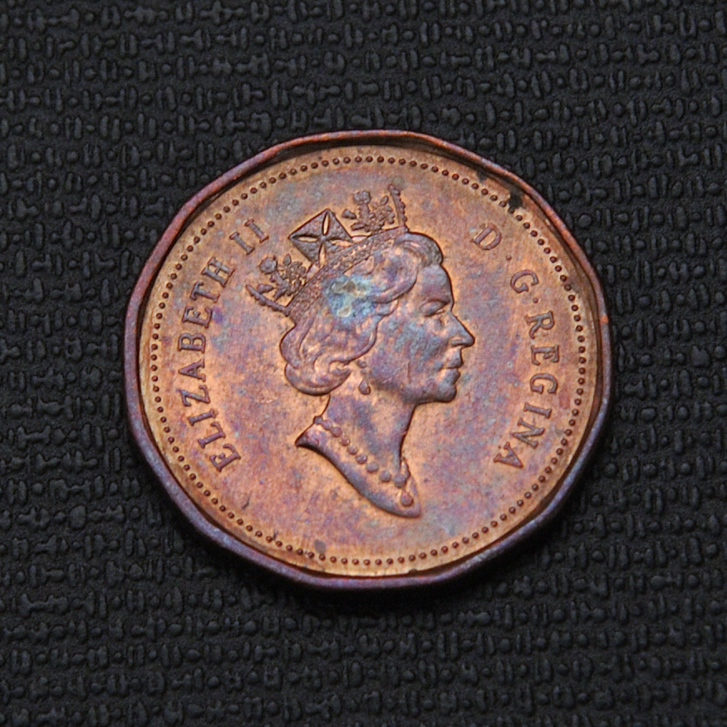 The 1990 Canadian 1 cent coin features a portrait of Queen Elizabeth II on the obverse, designed by Dora de Pédery-Hunt, depicting the Queen wearing a circular diamond crown decorated with roses, shamrocks, and thistles. On the reverse, it shows the iconic design of two maple leaves on the same twig, created by George Edward Kruger-Gray, symbolizing Canadian pride and natural beauty. The coin is made mainly of copper (98%), with small amounts of tin and zinc, weighs 2.5 grams, has a diameter of 19.1 mm, and a plain edge. Approximately 218 million circulation coins were minted that year. The 1990 penny also marked the first time the Queen’s portrait was designed by a Canadian. Notably, a rare 1990 variation with an obverse die from 1989 exists, making it a sought-after collector’s item.