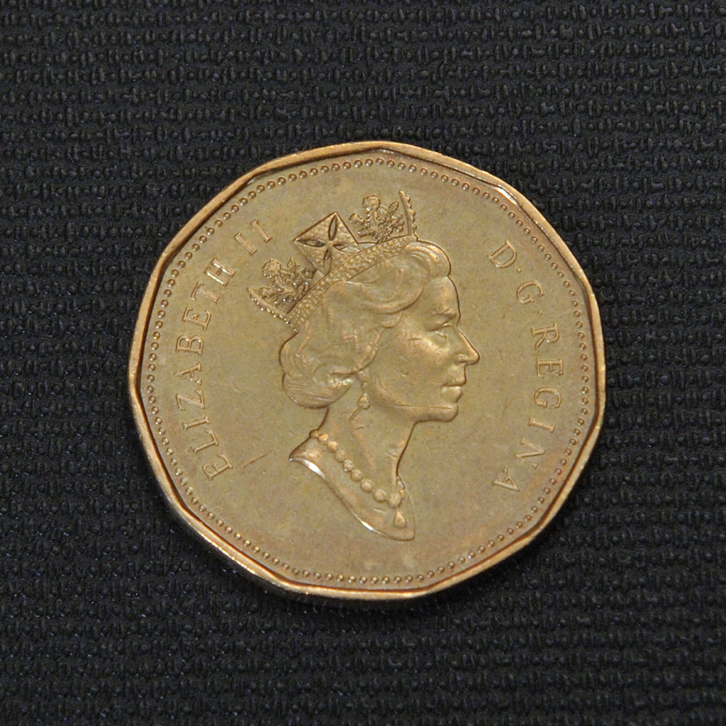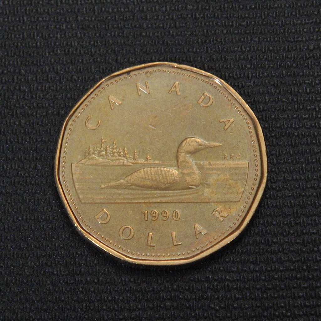 The 1990 Canadian 1 dollar coin is an eleven-sided golden coin featuring Queen Elizabeth II on the obverse and a common loon on the reverse, symbolizing Canada’s currency identity.