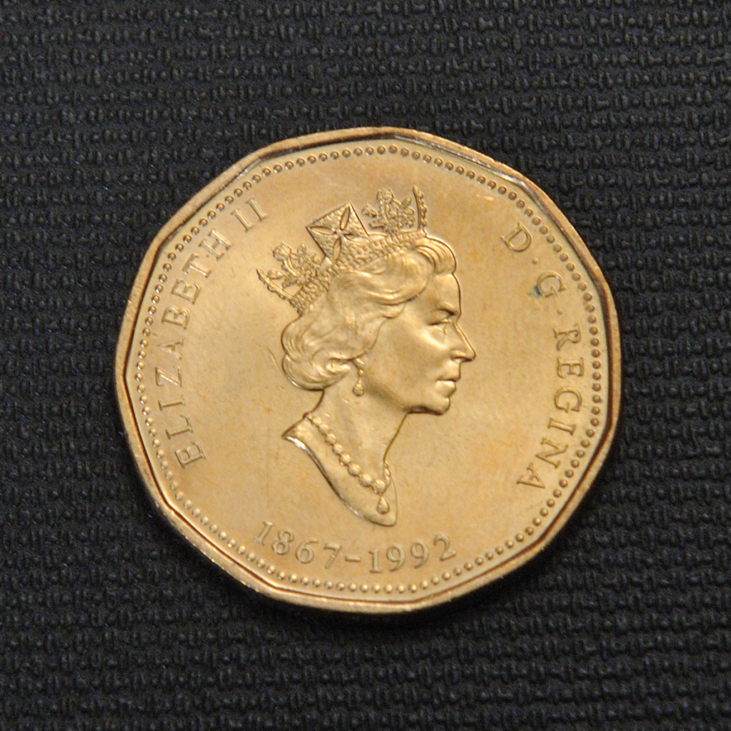 The 1992 Canadian 1 dollar coin commemorates the 125th anniversary of Canadian Confederation and is made of bronze-plated nickel, weighing 7 grams with a diameter of 26.5 mm. The obverse features a bust of a 64-year-old Queen Elizabeth II wearing a diamond crown decorated with roses, shamrocks, and thistles, designed by Dora de Pedery Hunt. The reverse, designed by Rita Swanson, portrays three schoolchildren in front of the Centre Block of Parliament Buildings, with one child holding a Canadian flag and another pointing to the Peace Tower clock set at 1:25, symbolizing 125 years of Confederation. The coin is 11-sided with a smooth edge, minted by the Royal Canadian Mint in both Ottawa and Winnipeg, with about 23 million circulated and a small additional number in uncirculated quality. Its design represents a key moment in Canadian history while adhering to the general specifications of Canadian dollar coins in circulation at the time.