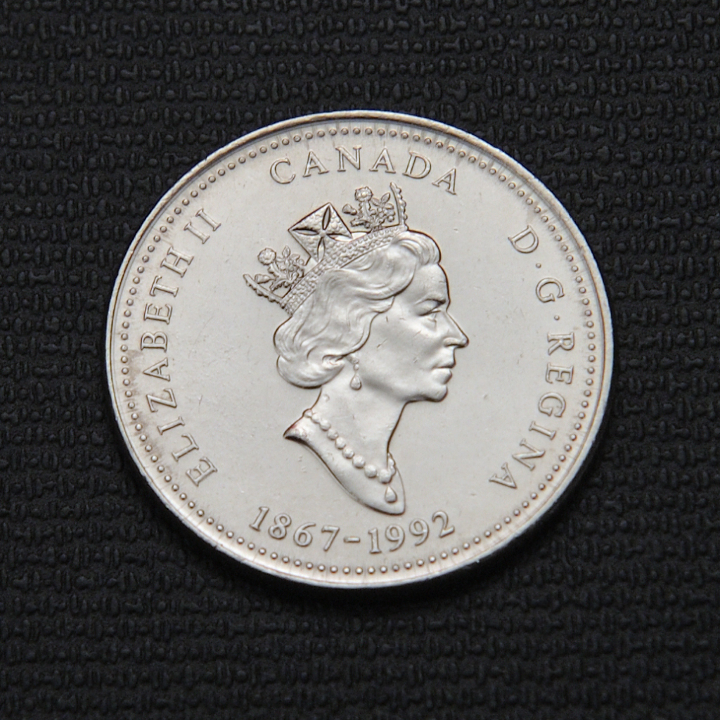 The 25-cent British Columbia coin made by Canada in 1992 features a design celebrating the province’s natural coastal beauty with mountains, broad coniferous forests, and two killer whales in the foreground, released for the 125th anniversary of Confederation.