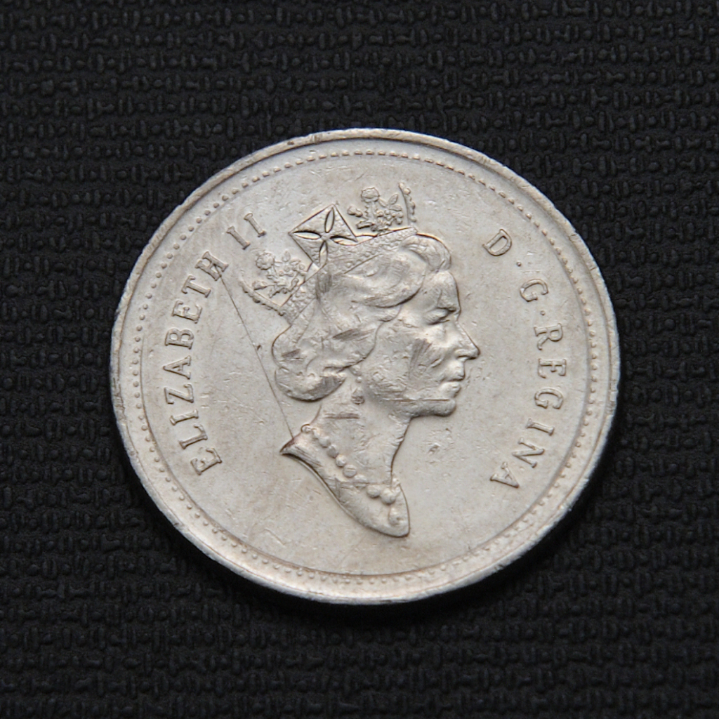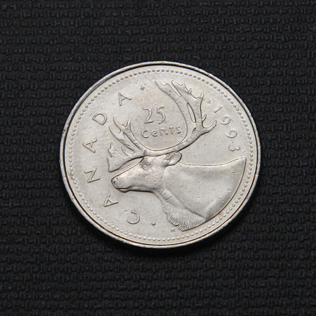 The 1993 Canadian 25-cent coin, commonly known as the quarter, features a reverse design of a caribou head created by Emanuel Hahn, a classic symbol used on Canadian quarters since 1937. The obverse displays a bust of Queen Elizabeth II wearing a circular diamond crown decorated with roses, shamrocks, and thistles, designed by Arnold Machin. This quarter is made of pure nickel, weighs 5.05 grams, has a diameter of 23.88 mm, and a reeded edge. It is magnetic and was minted by the Royal Canadian Mint with a mintage of about 73.7 million coins. The coin has a milled edge and medal alignment, with the inscriptions “ELIZABETH II D – G – REGINA” on the obverse and “CANADA 25 CENTS 1993” on the reverse.