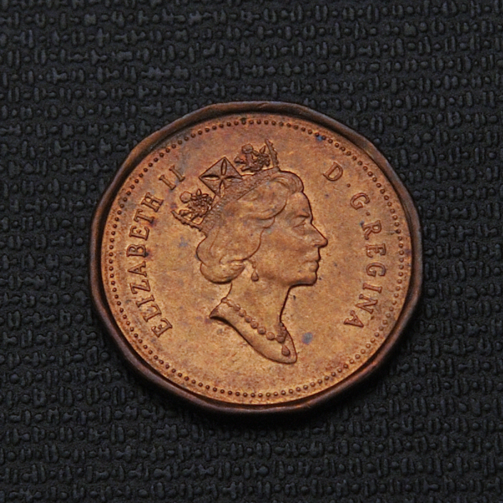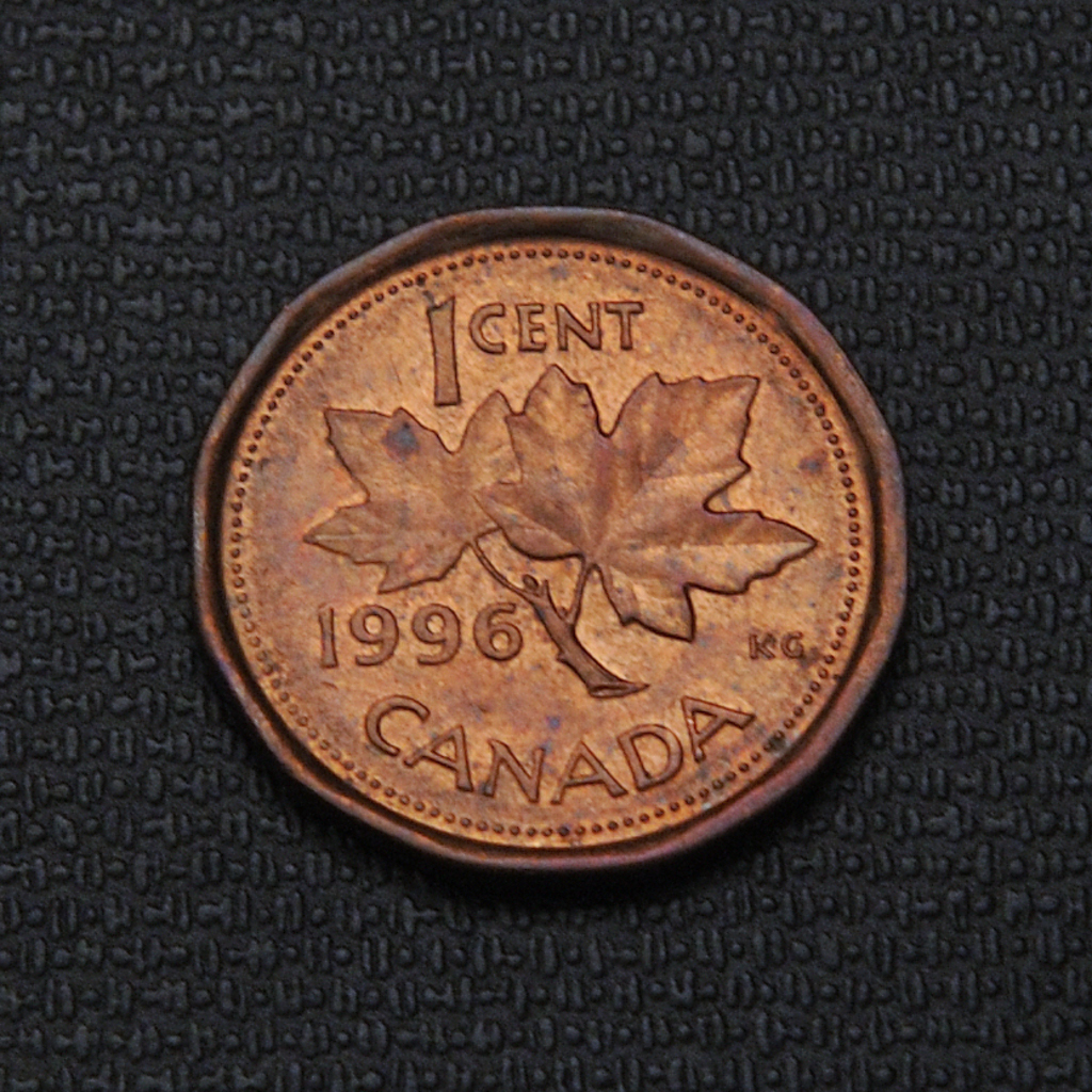 The 1996 Canadian 1 cent coin is a business strike coin composed of 98% copper, 0.5% tin, and 1.5% zinc, weighing 2.5 grams with a diameter of 19.1 mm and having a plain edge. The obverse features a bust of Queen Elizabeth II wearing a circular diamond crown, designed by Dora de Pédery-Hunt, while the reverse shows two maple leaves on the same twig, designed by G. E. Kruger-Gray. This coin had a mintage of approximately 445,746,000 for circulation and 112,835 proof coins, with a melt value of about $0.03 CAD as of 2025. Although most 1996 pennies are common, there are some rarer copper planchet varieties and error coins sought by collectors that can be worth more. The coin remains a classic symbol of Canadian heritage before the penny was discontinued in 2013.