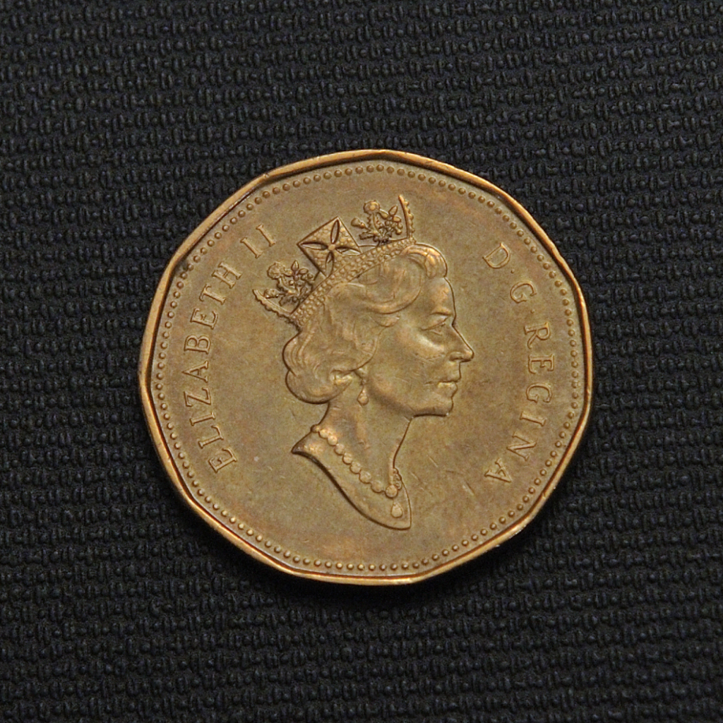 The 1996 Canadian 1 dollar coin, commonly known as the “loonie,” is an 11-sided coin composed of 91.5% nickel and 8.5% bronze, weighing 7 grams and measuring 26.72 mm in diameter with a plain edge. The obverse features a bust of Queen Elizabeth II, designed by Dora de Pédery-Hunt, wearing a diamond crown decorated with roses, shamrocks, and thistles, while the reverse showcases a common loon swimming on water with an island in the background, a design by Robert R. Carmichael. This coin is magnetic due to its composition and was struck by the Royal Canadian Mint as part of its circulation series. It retains the traditional gold color associated with the loonie series introduced in 1987, and the 1996 mintage included a large number for circulation totaling over 17 million pieces. The coin’s plain smooth edge and medal alignment complete its distinctive appearance.
