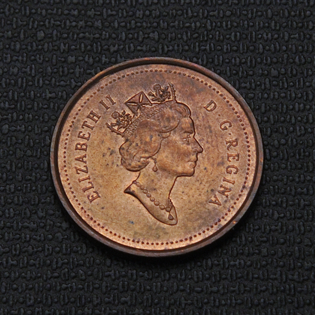 The 1997 Canadian 1 cent coin marked a significant year as it returned to a round shape from the previous 12-sided form and changed its composition from bronze to copper-plated zinc. The obverse features a bust of Queen Elizabeth II wearing a circular diamond crown decorated with roses, shamrocks, and thistles, designed by Dora de Pédery-Hunt. The reverse shows two maple leaves on the same twig, a design by G. E. Kruger-Gray. The coin weighs 2.25 grams, measures 19.05 mm in diameter, and has a plain edge. Over 549 million circulation coins were minted alongside a smaller number of proofs. This penny is non-magnetic, has a smooth edge, and uses medal alignment. Many coins from this year exist, but a few rare experimental prototypes minted in special alloys exist and are highly valuable among collectors.