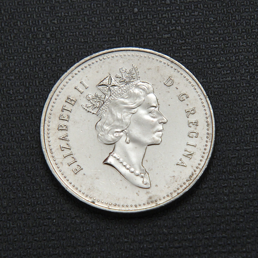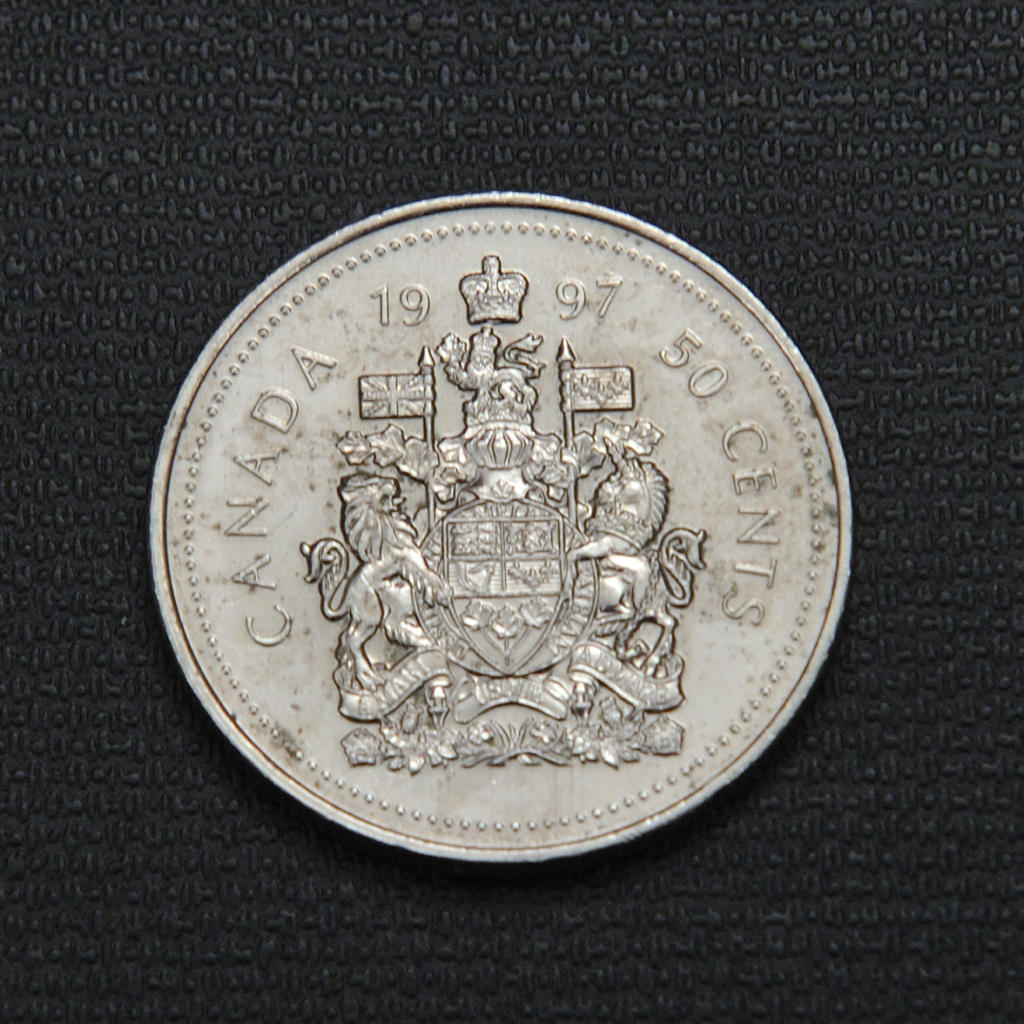 The 1997 Canadian 50 cents coin features the stylized Canadian Coat of Arms on its reverse, designed by Cathy Bursey-Sabourin, with the obverse displaying the bust of Queen Elizabeth II wearing a circular diamond crown decorated with roses, shamrocks, and thistles, designed by Dora de Pédery-Hunt. Made of nickel, this coin has a diameter of 27.13 mm, a weight of 8.1 g, a thickness of 1.9 mm, and a reeded edge with medal alignment. In 1997, about 387,000 coins were minted for circulation. The coat of arms on the coin symbolizes Canada’s political roots and heritage, featuring emblems from England, France, Scotland, and Ireland, with the motto of the Order of Canada added in the 1990s, highlighting a rich national symbolism. Though minted for circulation, these coins often have higher values in mint state conditions for collectors.
