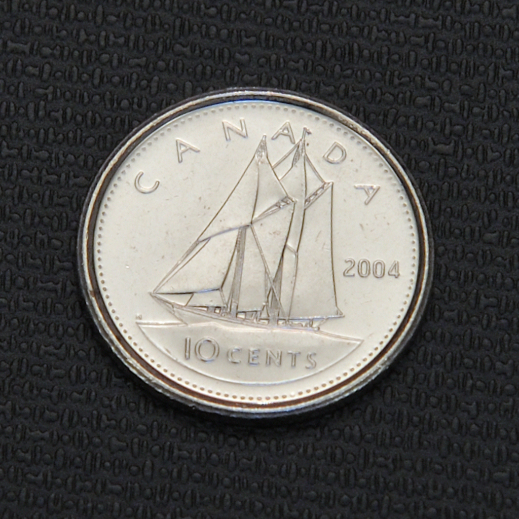 The 2004 Canadian 10 cents coin is a copper-plated steel dime featuring Queen Elizabeth II on the obverse and the Bluenose schooner on the reverse, minted in high circulation by the Royal Canadian Mint.