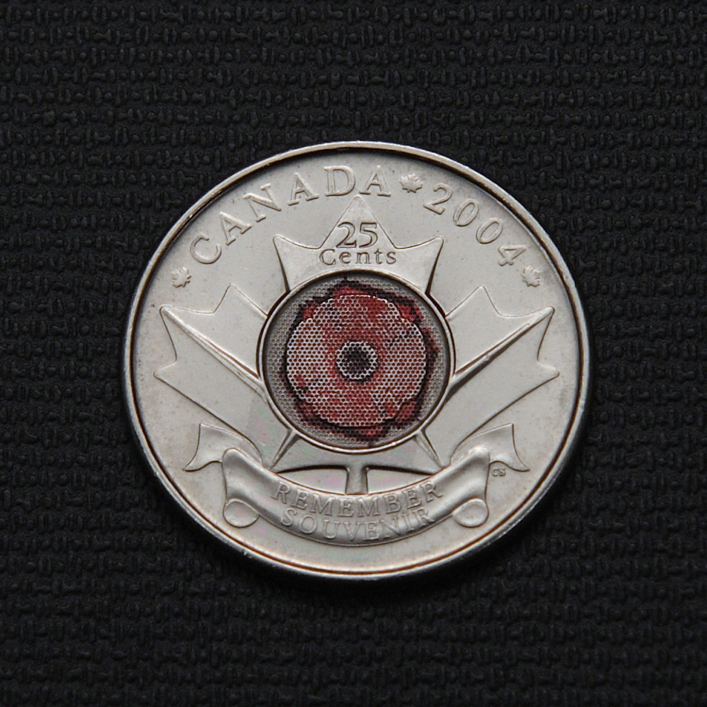 The 2004 Canadian 25-cent P poppy coin is notably the world’s first coloured circulation coin, issued by the Royal Canadian Mint to honor Remembrance Day and commemorate the sacrifice of Canadian war veterans. It features a red poppy stamped on the reverse with pressurized ink and an innovative fluorescent security coating to preserve the color, set in the middle of a maple leaf. The obverse displays an uncrowned bust of Queen Elizabeth II, designed by Susanna Blunt, while the reverse poppy design is by Cosme Saffioti. The coin is made from copper-plated steel (94% steel, 3.8% copper, 2.2% nickel), weighs 4.4 grams, and has a diameter of 23.88 mm with a reeded edge. About 28.97 million of these coins were circulated in 2004, each inscribed with “CANADA 2004 REMEMBER SOUVENIR” around the poppy design.