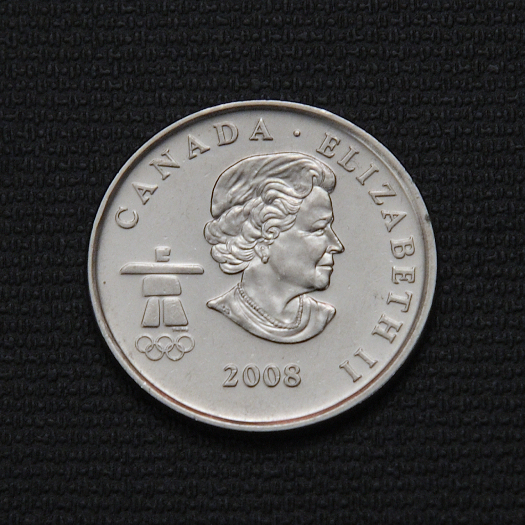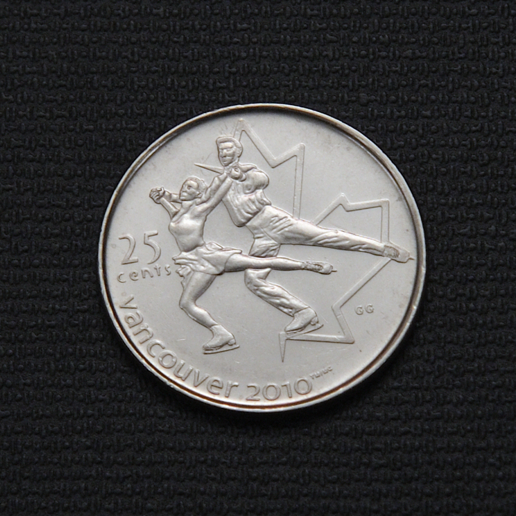The 2008 Canadian 25-cent coin features a figure skater design by Glen Green in front of a stylized maple leaf, commemorating the Vancouver 2010 Winter Olympics, with the inscription “VANCOUVER 2010” and Queen Elizabeth II’s right profile on the obverse. It is composed of 94% steel, 3.8% copper, and 2.2% nickel plating and was issued in brilliant uncirculated condition with a mintage of 22.4 million.