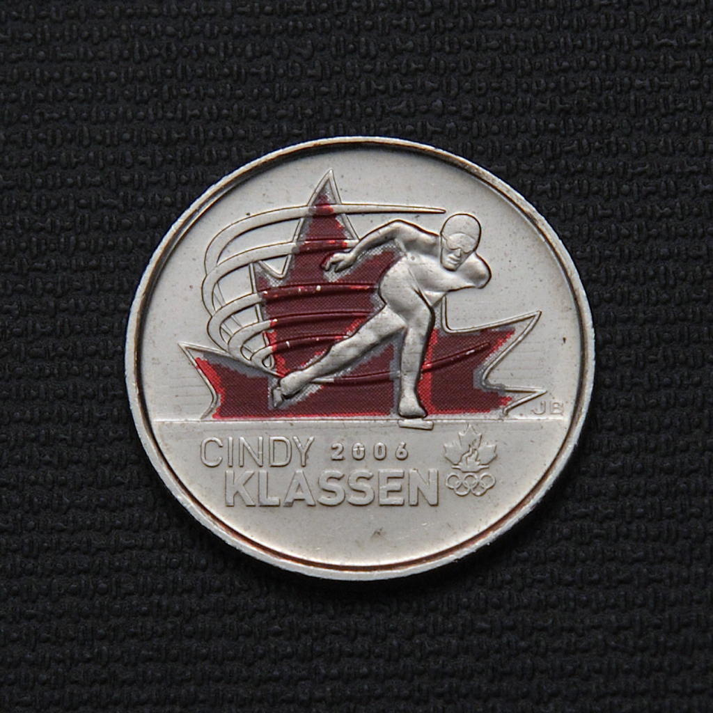 The 2009 Canadian 25-cent coin celebrating Cindy Klassen features her speed skating in front of a maple leaf and the Canadian Olympic Committee logo, with her name and the year 2006 inscribed, commemorating her five medals at the Turin Winter Olympics.