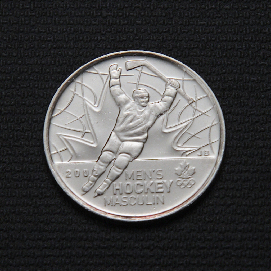 The 2009 Canadian men’s hockey 25-cent coin was issued by the Royal Canadian Mint to commemorate the men’s hockey gold medal victory at the 2002 Salt Lake City Winter Olympics, which was voted the #1 Canadian Olympic Winter Games Moment ever; it has a composition of copper-plated steel (94% steel, 3.8% copper, 2.2% nickel), weighs 4.4 g, measures 23.88 mm in diameter, and features a reeded edge with medal alignment. The obverse side has an uncrowned bust of Queen Elizabeth II designed by Susanna Blunt, while the reverse, designed by Jason Bouwman, shows the inscription “2002 MEN’S HOCKEY MASCULIN” along with an image representing the men’s hockey moment. Approximately 22 million circulation coins were minted, including a special colored edition of 3 million with a red maple leaf, which was placed randomly into circulation and sold at select locations in Canada.