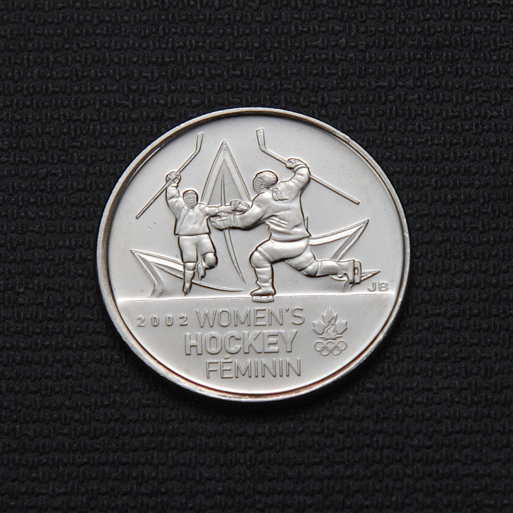 The 2009 Canadian 25-cent coin celebrates the women’s hockey gold medal won at the 2002 Salt Lake City Winter Olympics. It is part of the Royal Canadian Mint’s circulation coin series related to the 2010 Vancouver Olympic Games. The coin was designed by Jason Bouwman and depicts two female hockey players raising their arms in victory with a red maple leaf behind them and the 2002 Women’s Hockey inscription. Approximately 22 million circulation coins were produced with a copper-plated steel composition, weighing 4.4 grams and measuring 23.88 mm in diameter. Additionally, around 3 million special colorized versions with a brilliant red maple leaf were minted and distributed randomly in circulation as well as available in special retail locations. The obverse features the uncrowned bust of Queen Elizabeth II, designed by Susanna Blunt.