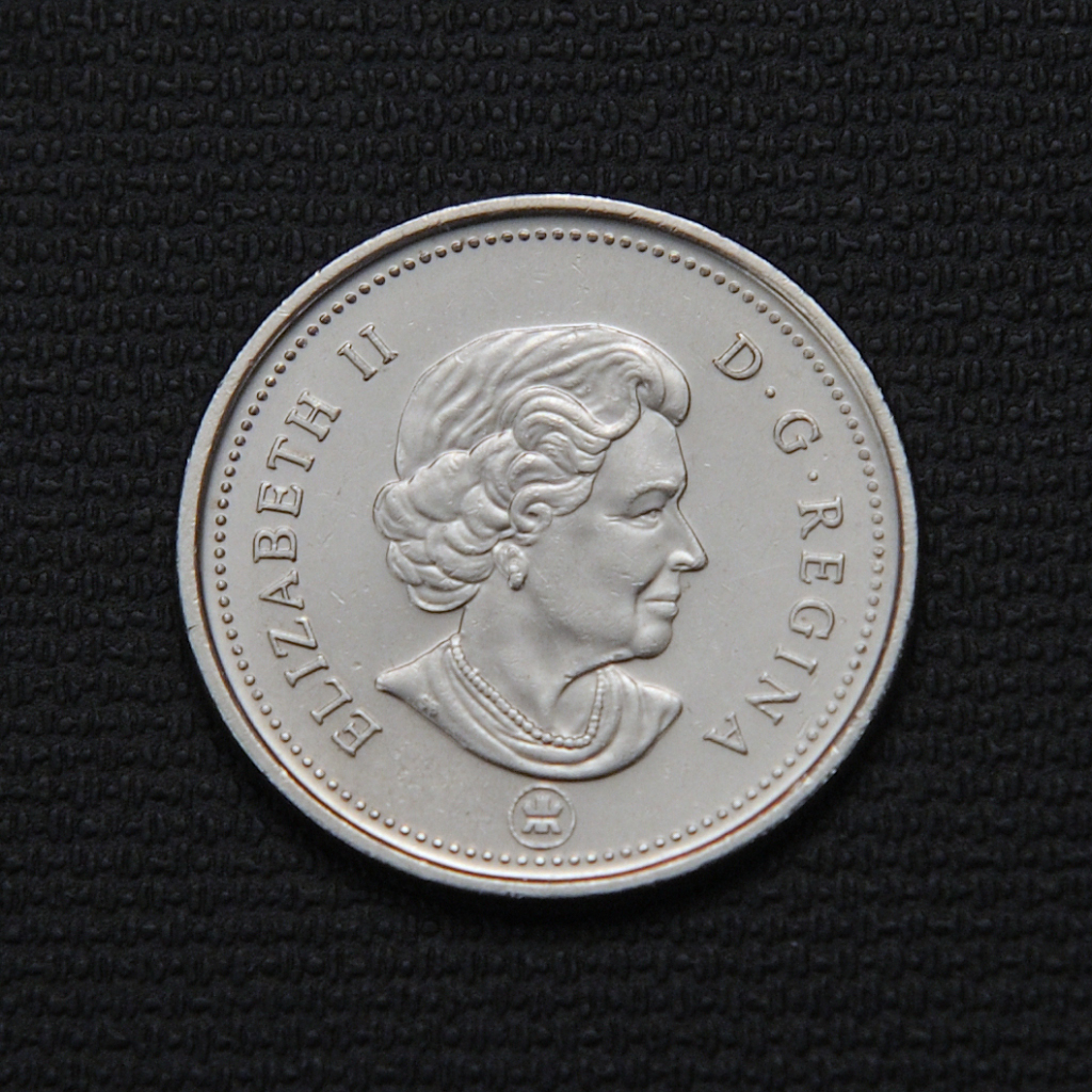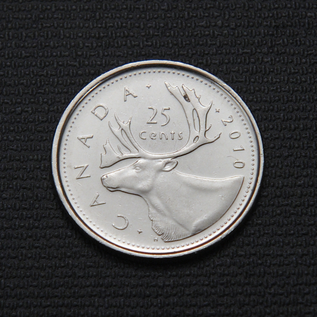 The 2010 Canadian 25 cents features a caribou head on the reverse designed by Emanuel Hahn, the uncrowned effigy of Queen Elizabeth II on the obverse by Susanna Blunt, and is made of copper-plated steel with a mintage in circulation.