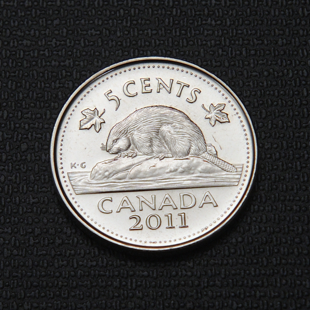 The 2011 Canadian 5 cents coin, also known as the nickel, features a copper-plated steel composition consisting of 94.5% steel, 3.5% copper, and 2% nickel, giving it a magnetic property and a weight of 3.95 grams with a diameter of 21.1 mm and a smooth, plain edge. The obverse side depicts an uncrowned right-profile bust of Queen Elizabeth II surrounded by the inscription “ELIZABETH II D – G – REGINA,” designed by Dora de Pédery-Hunt, while the reverse side showcases the traditional beaver sitting on a log, designed by G.E. Kruger-Gray, with the inscriptions “5 CENTS” and “CANADA 2011” flanked by maple leaves. In 2011, the coins were minted by the Royal Canadian Mint and were produced for general circulation, as well as in uncirculated and specimen finishes, with a total circulation mintage of 230,328,000 pieces.