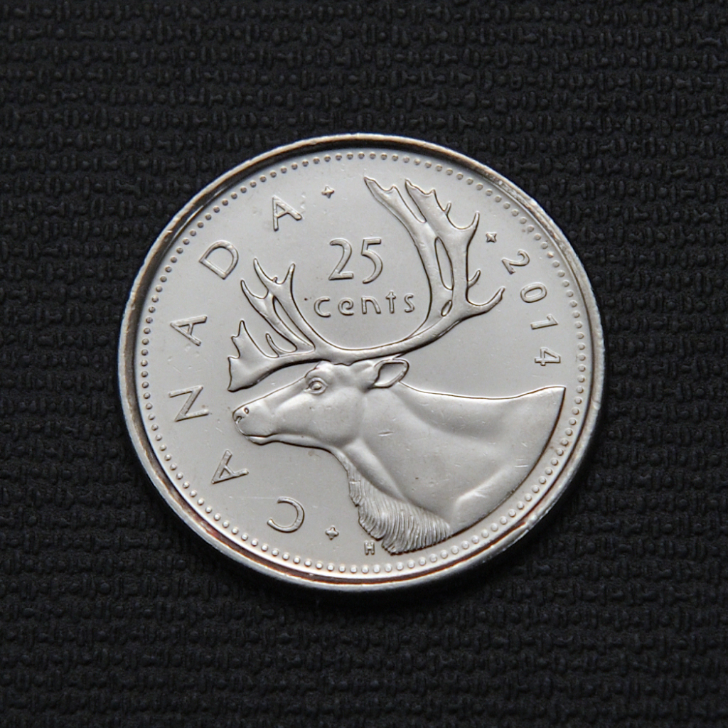 The 2014 Canadian 25-cent coin features an uncrowned bust of Queen Elizabeth II on the obverse and a caribou head on the reverse, is made of copper-plated steel (94% steel, 3.8% copper, 2.2% nickel), weighs 4.4 grams, has a diameter of 23.88 mm with a reeded edge, and was minted by the Royal Canadian Mint in a circulation finish.