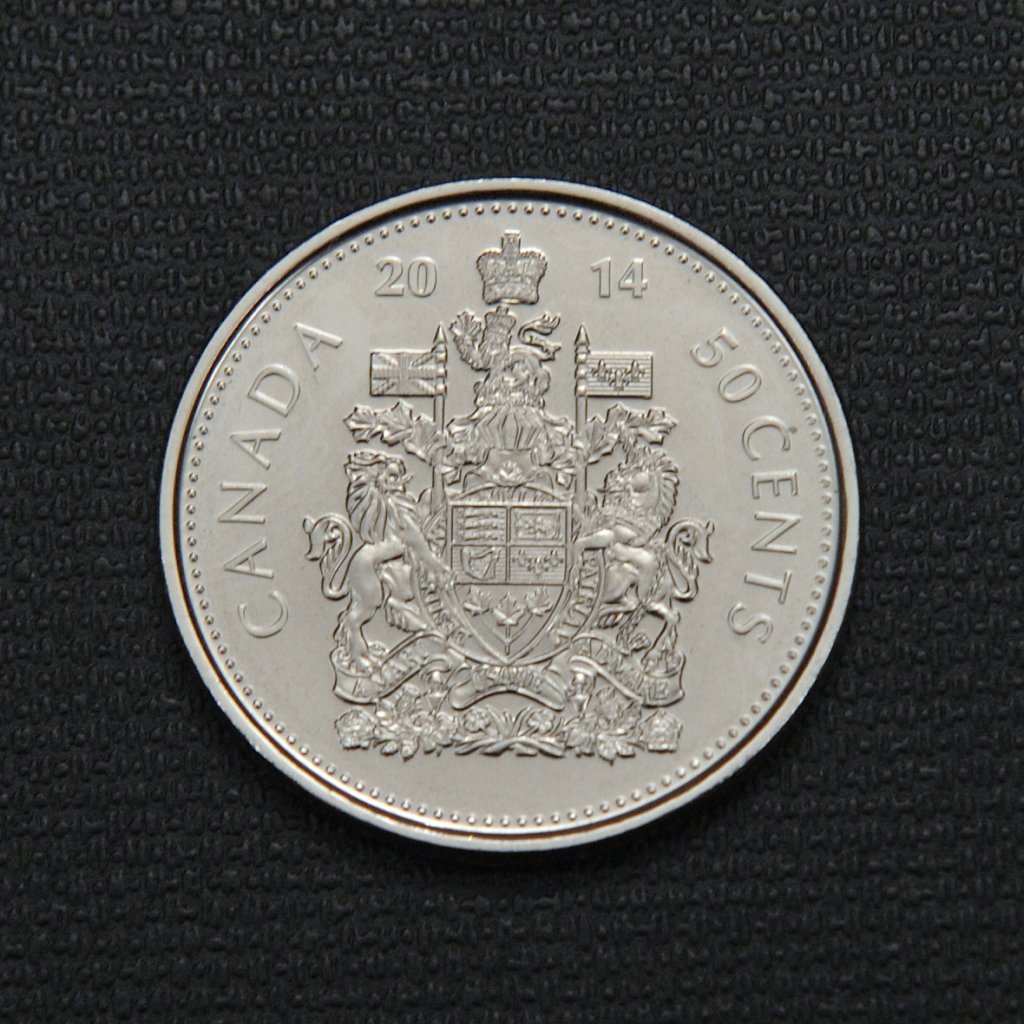 The 2014 Canadian 50-cent coin is a limited-mintage circulation coin bearing the national coat of arms and Queen Elizabeth II’s effigy, rarely seen in everyday transactions.