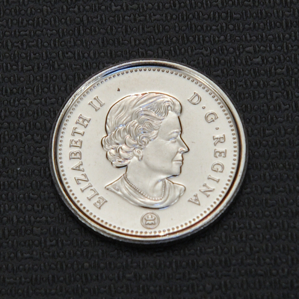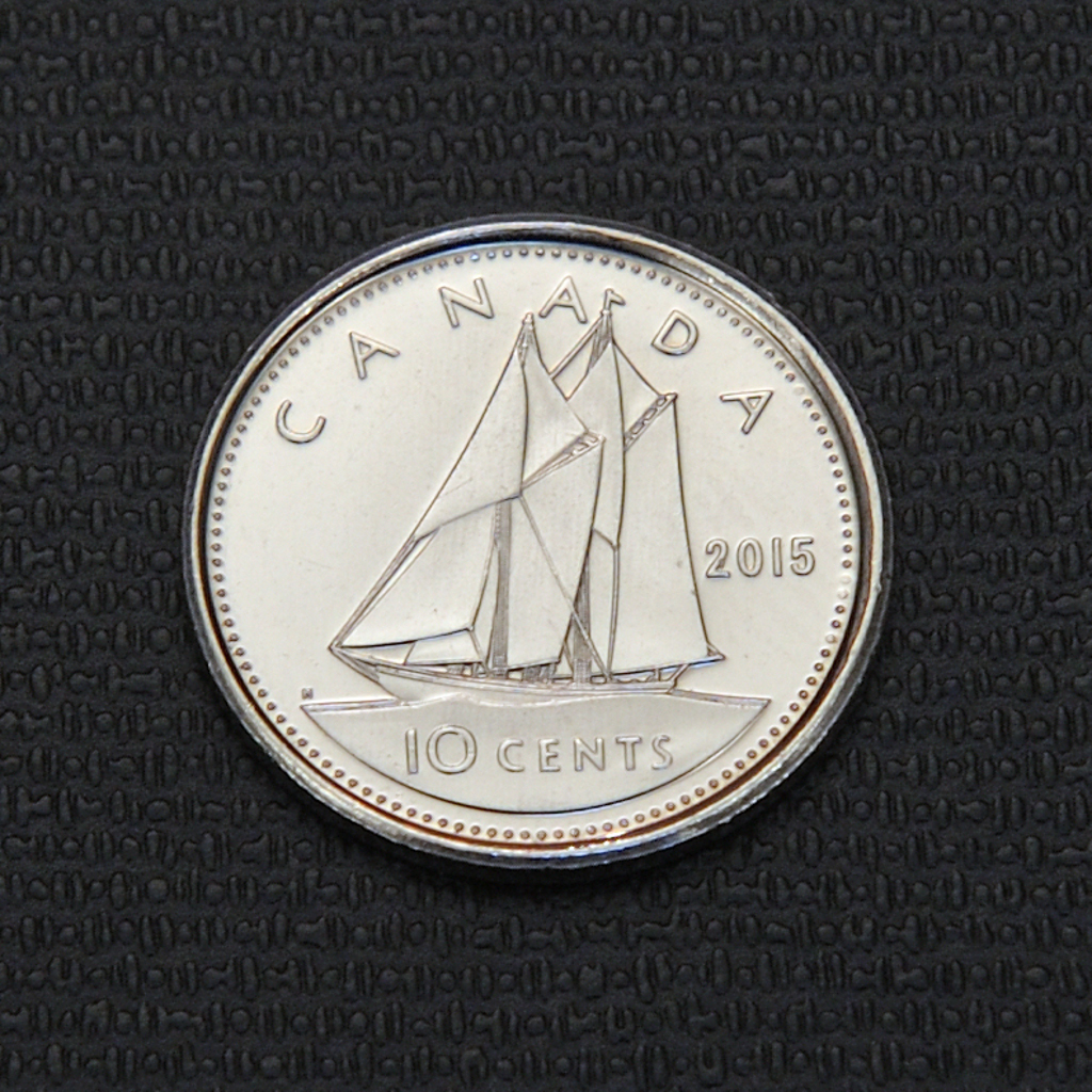 The 2015 Canadian dime is a small, copper-plated steel coin depicting the Bluenose schooner and Queen Elizabeth II, with a massive special collector silver and gold-plated edition also issued that year.