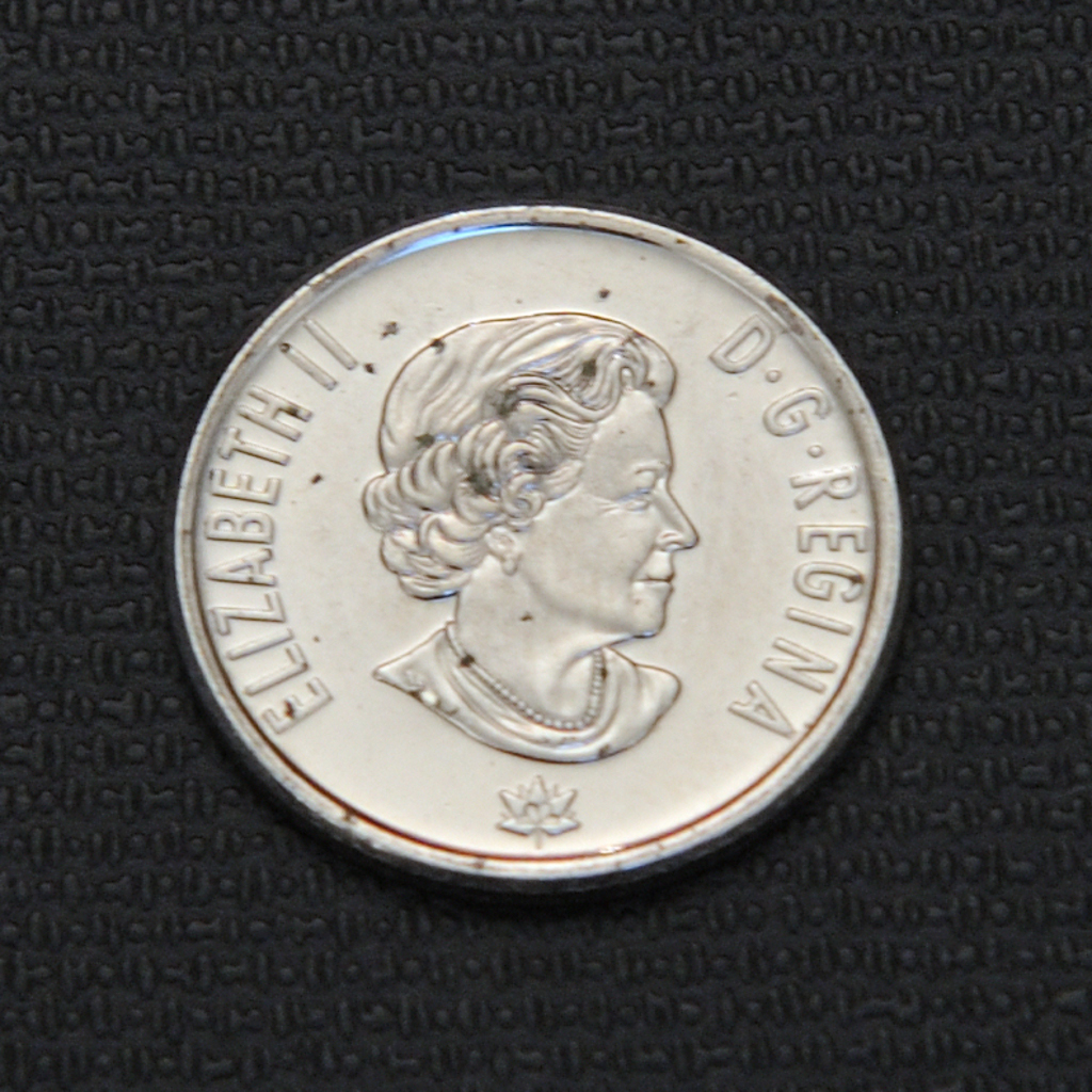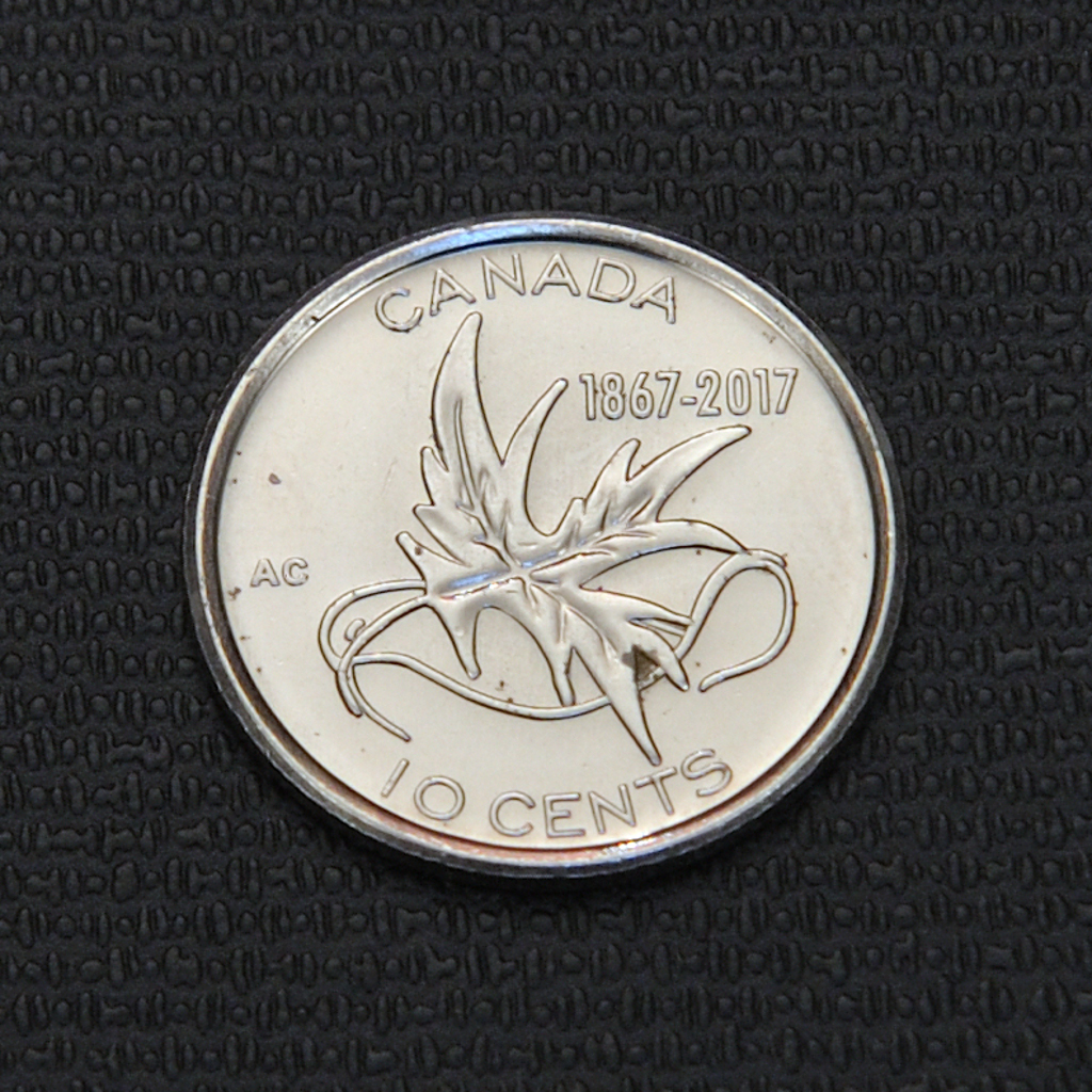 The 2017 Canadian 10-cent coin, commemorating Canada’s 150th anniversary, features a unique reverse design titled “Wings of Peace,” created by Amy Choi of Calgary, Alberta. The reverse showcases an airborne maple leaf forming the wings and tail of a delicately outlined dove holding the leaf in its beak, symbolizing hope, peace, and good faith. The obverse bears the uncrowned bust of Queen Elizabeth II, designed by Susanna Blunt, with the inscription “ELIZABETH II D – G – REGINA.” The coin is made of nickel-plated steel, weighs 1.75 grams, has a diameter of 18.03 mm, a reeded edge, and is magnetic. About 20 million of these circulation coins were minted by the Royal Canadian Mint as part of a national contest celebrating Canada’s achievements and character during its first 150 years.