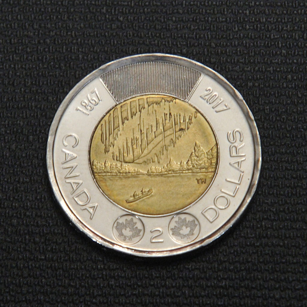 The 2017 uncolored Canada 2 dollar coin commemorating 150 years showcases the Northern Lights and paddlers in a detailed, elegant design symbolizing the “Dance of the Spirits.”